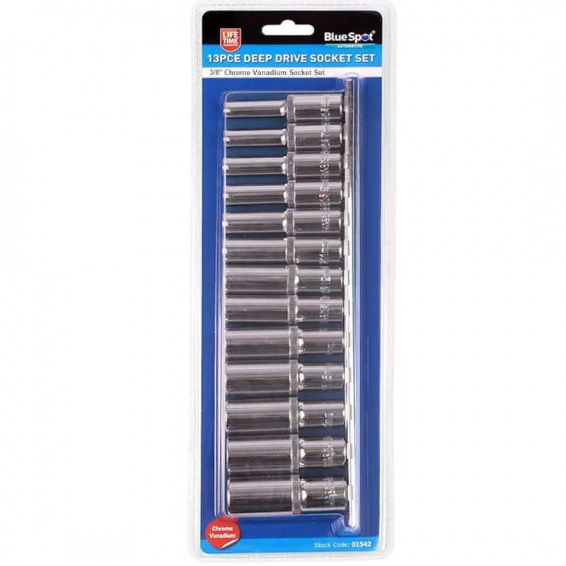 Bluespot Tools 3/8 inch drive deep reach sockets for better access to recessed bolts and bolts with a long stud for use on a 3/8 inch ratchet.