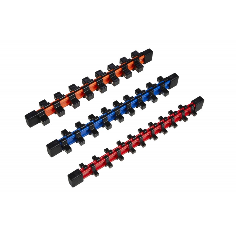 The BlueSpot Automotive 3 piece colour coded double sided socket holders have 54 clips and are for use with 1/4 inch, 3/8 inch and 1/2 inch drive sockets.