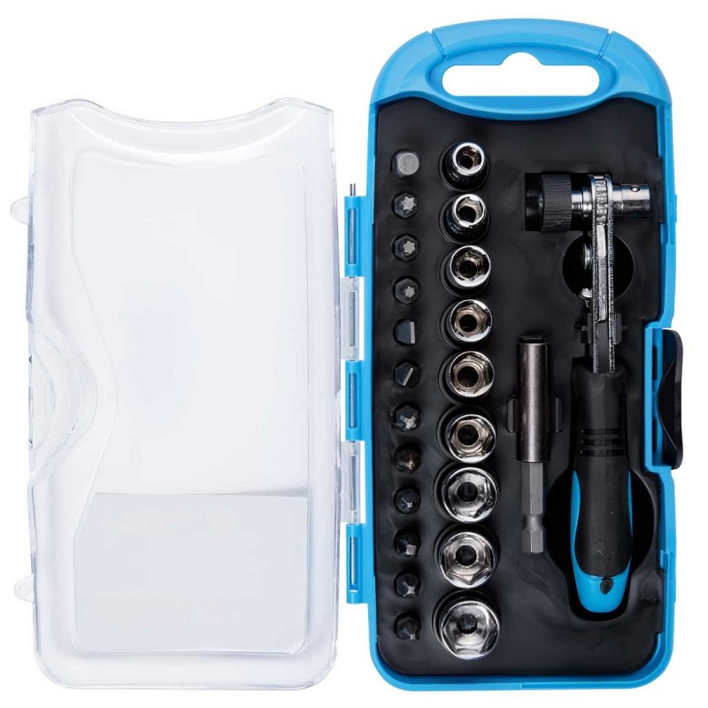 The Blue Spot 23 Piece Offset Ratchet Bit and Socket Set manufactured from carbon steel for increased durability and strength