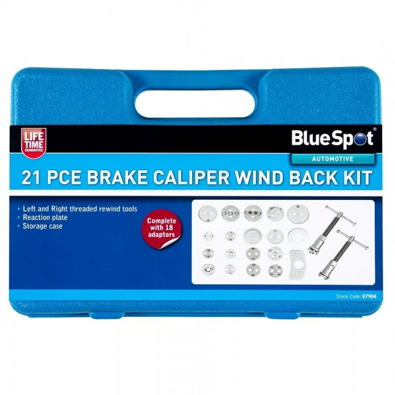 The BlueSpot Tools 07904 large 21 Piece Wind Back Brake Caliper Kit is specially designed for the replacing of brake pads and discs.
