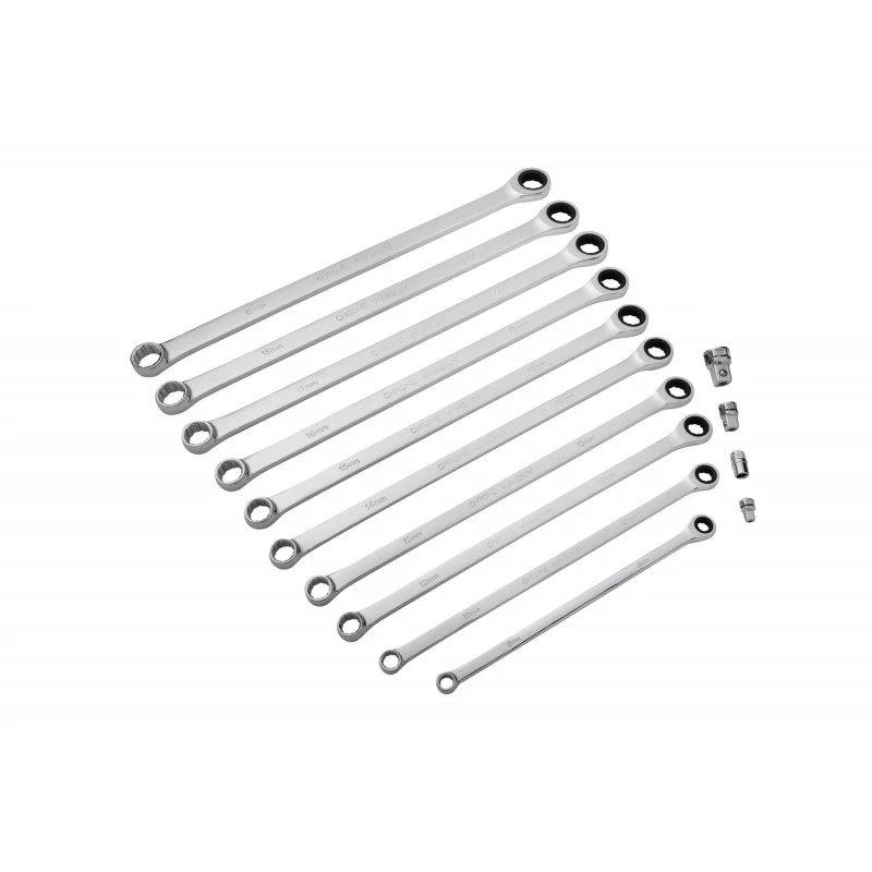 The BlueSpot 10 piece extra long ratchet spanner and adaptor Set is made from a high quality chrome vanadium for increased durability and strength.