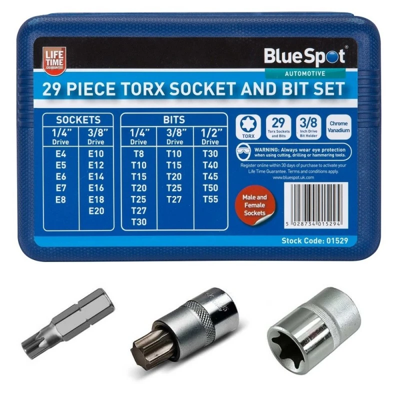 The BlueSpot 29pc Torx Socket And Bit Set manufactured from tough chrome vanadium steel for increased durability.