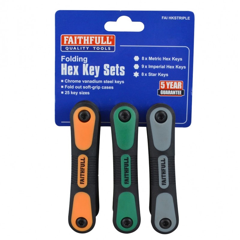 The Faithfull Premium Quality Hexagonal Key Set contains 3 individual folding key sets covering the most commonly used Metric, A/F and Star keys.