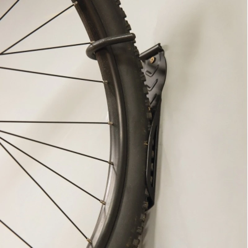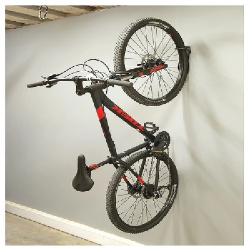 Heavy duty, pressed-steel hook for hanging a bicycle vertically to save space.