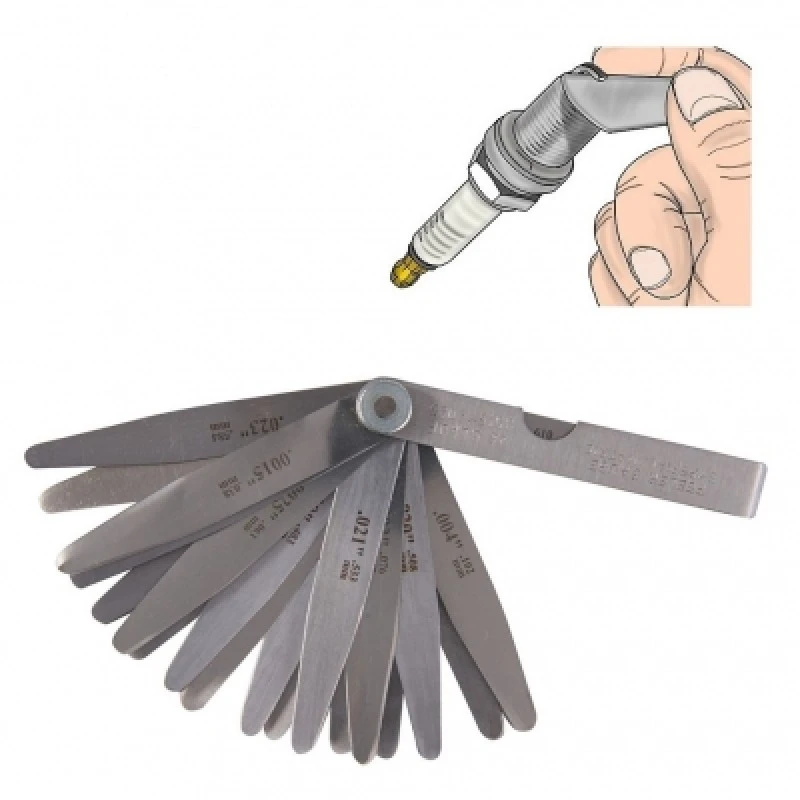 Combination leaf feeler gauge accurately measures gaps between components such as spark plugs.