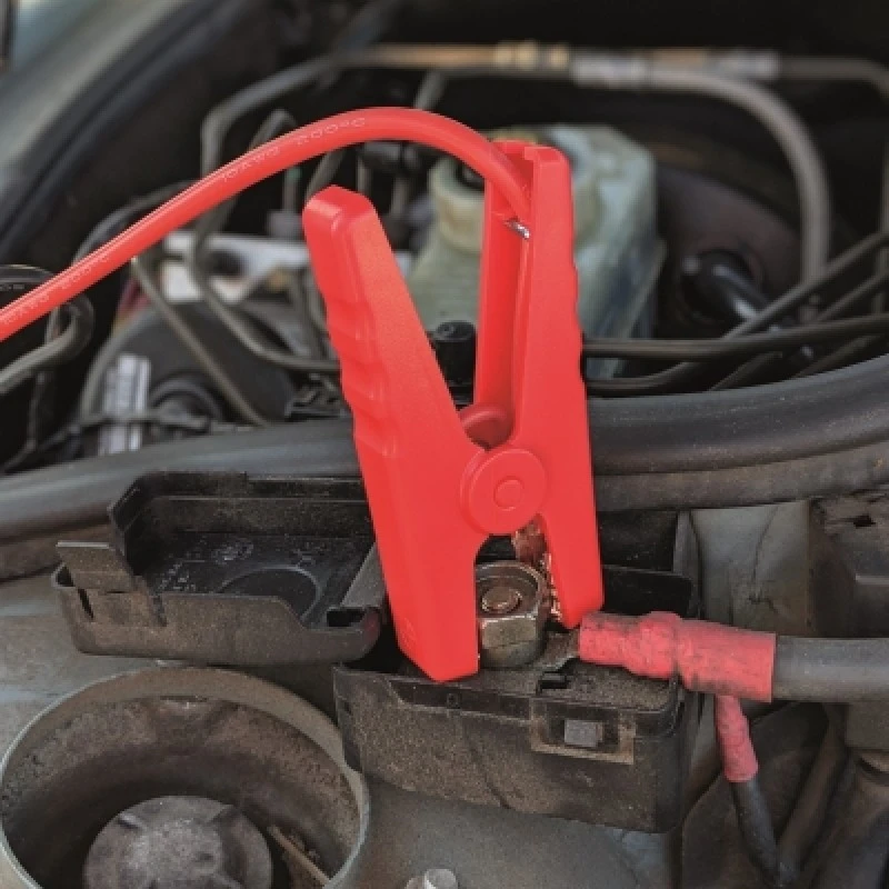 Includes lithium-cobalt polymer power bank and Smart Jump Start Protector Unit with cables and heavy duty clamps.